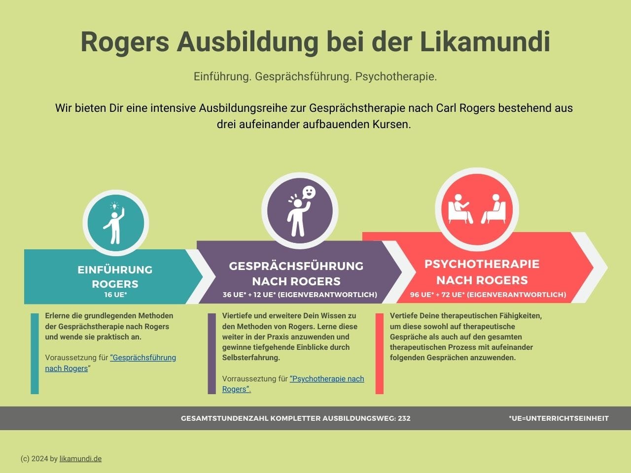 - Psychotherapie nach Rogers: 96 UE + 72 UE (eigenverantwortlich). Lerne psychotherapeutische Prozesse zu planen und zu begleiten.